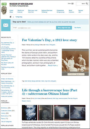 Leon Perrie, curator of botany, has been blogging on the Te Papa blog since October 2008. For him the blog is something that is 'increasingly about updates and notifications', whereas the Collections Online website is 'more of an authoritative voice, something of permanence, where we deliver information about things'. Perrie uses the blog to disseminate research, albeit in a more popular and accessible format. He feels that 'there's no point in doing stuff if you don't provide a way for people to access it'. He thinks that 'it's really important to inform people and the blog is simply another way of doing that'.